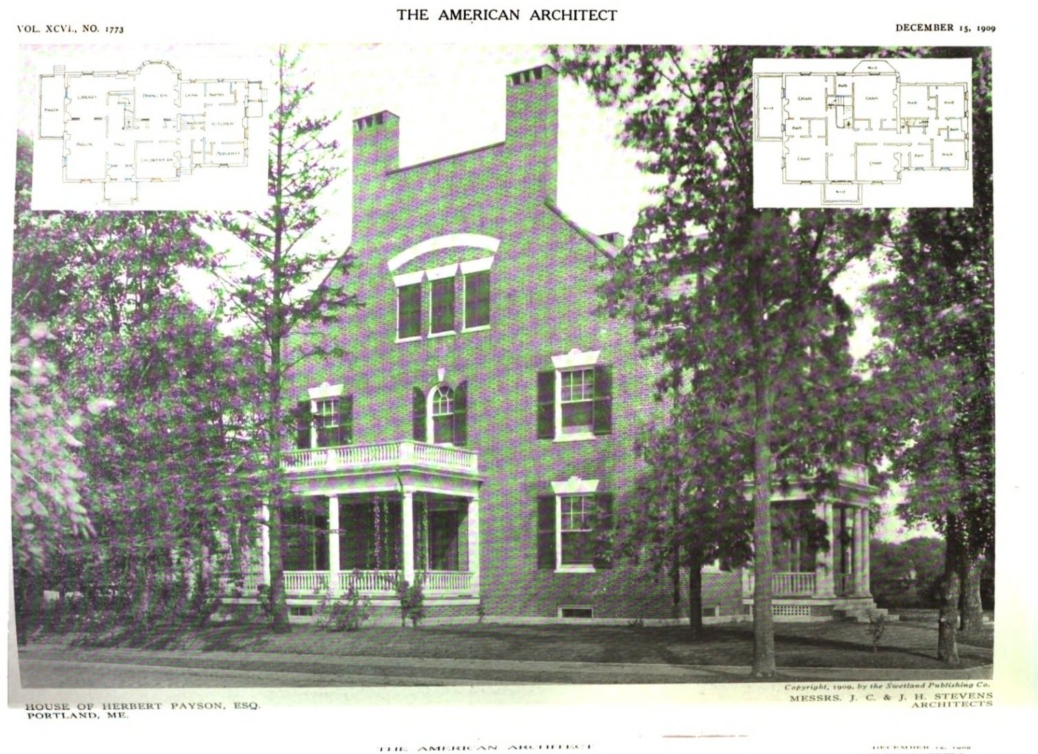 Prominent Portland architects John Calvin Stevens and John Howard Stevens designed 71 Bowdoin Street in 1904 for Herbert and Sally Payson (1860-1940). Hebert Payson was the grandson of Edward Payson, a minister for the Payson Memorial Church and son of Henry Payson, a successful banker and stockbroker. Sally Carroll Brown Payson was the daughter of Civil War general John Marshall Brown, and a granddaughter of John Bundy Brown, one of Portland’s most successful nineteenth-century businessmen and the builder of the Bramhall building. In 1910, Herbert and Sally Payson lived at 71 Bowdoin Street with their six children, a governess, and three servants. One of their children, Charles Shipman Payson, later married Joan Whitney, the noted New York philanthropist and art collector. Joan Whitney Payson founded and owned the New York Mets baseball team, while the Payson Wing at the Portland Museum of Art is named after Charles.